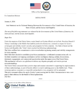 برعاية أمريكية: إسرائيل وسوريا والولايات المتحدة اتفقوا على إنشاء آلية لتبادل المعلومات الاستخباراتية، لتخفيف التوتر الأمني وإنشاء اتصالات دبلوماسية وتجارية.