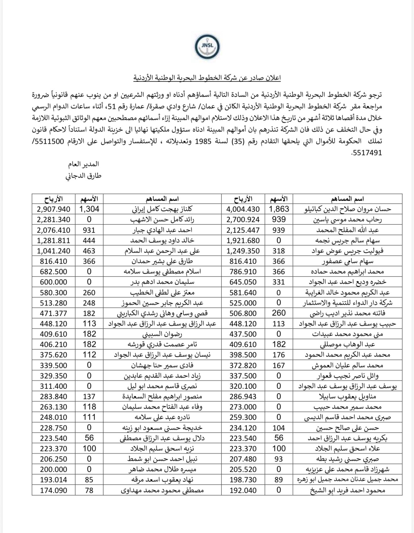 دعت شركة الخطوط البحرية الوطنية الأردنية السادة الواردة أسماؤهم في الإعلان، أو ورثتهم الشرعيين، أو من ينوب عنهم قانونيًا، إلى ضرورة مراجعة مقر الشركة الكائن في عمّان/ شارع وادي صقرة/ عمارة رقم (51)، خلال ساعات الدوام الرسمي، وذلك خلال مدة أقصاها ثلاثة أشهر من تاريخ نشر الإعلان، لاستلام مستحقاتهم المالية المبينة إزاء أسمائهم، مصطحبين الوثائق الثبوتية اللازمة.