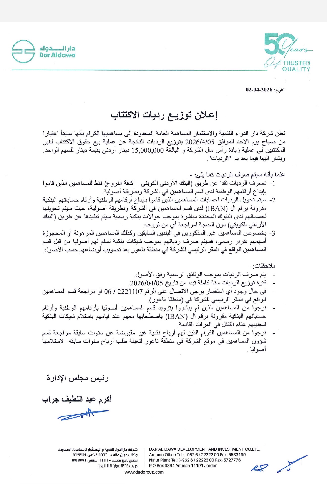 أعلنت شركة دار الدواء للتنمية والاستثمار، المساهمة العامة المحدودة، عن بدء توزيع رديات الاكتتاب الناتجة عن بيع حقوق الاكتتاب لغير المكتتبين في زيادة رأس مال الشركة، وذلك اعتباراً من صباح يوم الأحد الموافق 5 نيسان 2026.