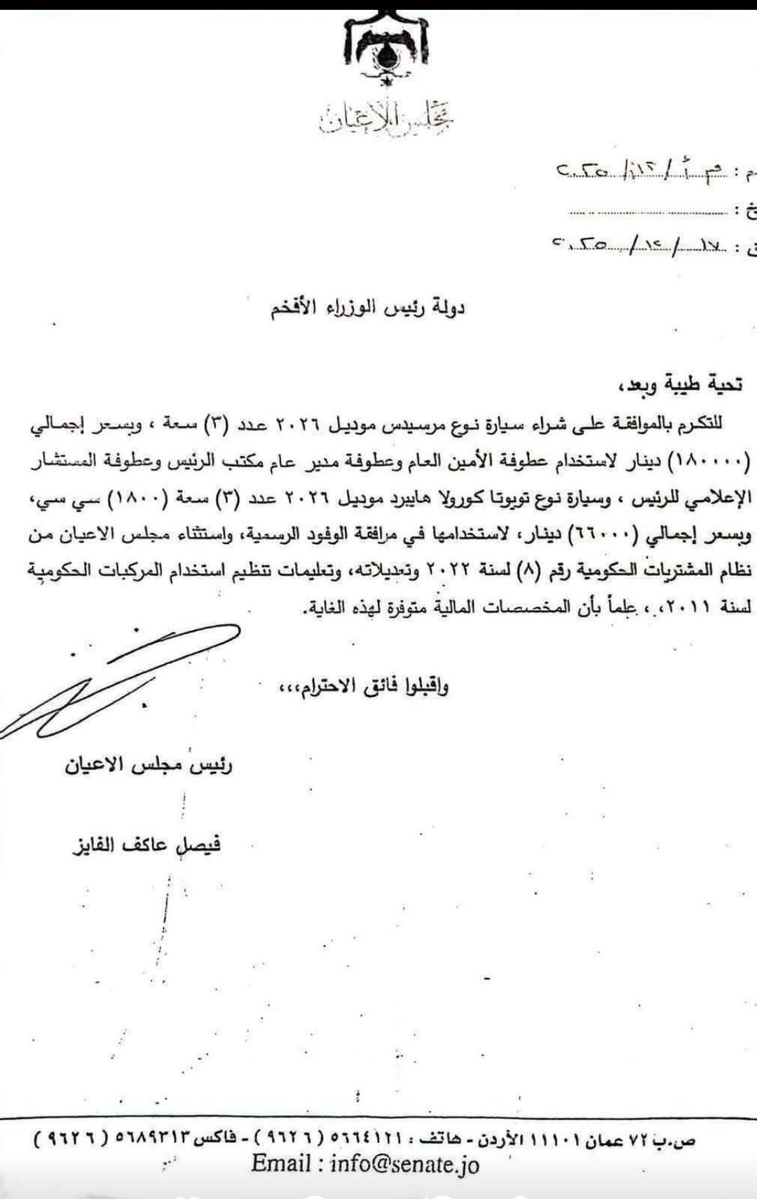 وبحسب الوثائق، تقدّم رئيس مجلس الأعيان فيصل الفايز بطلب رسمي إلى دولة رئيس الوزراء للحصول على الموافقة لشراء المركبات، مؤكدًا أن استخدامها سيكون لأغراض إدارية وليست لغايات سيادية أو طارئة.