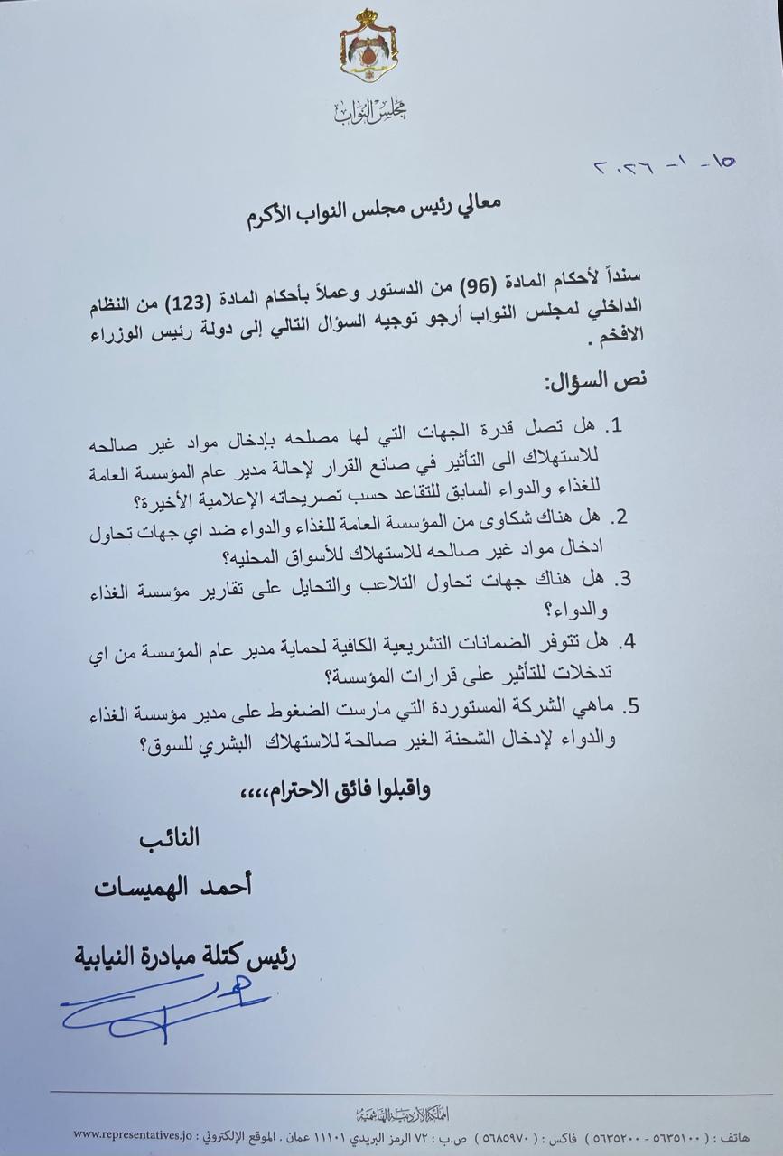 النائب هميسات يسأل الحكومة: هل أُحيل مهيدات للتقاعد تحت ضغوط إدخال مواد غير صالحة للأسواق؟