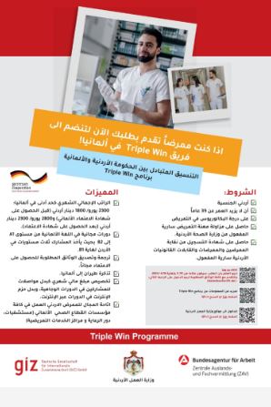 أعلنت الحكومة الفدرالية الألمانية، ممثلة بوكالة العمل الاتحادية في ألمانيا ((BA، وبالشراكة مع التعاون الدولي الألماني (GIZ)ووزارة العمل في إطار برنامج (TRIPLE WIN) عن فتح باب التقدم لوظيفة ممرض/ممرضة للأردنيين من حملة درجة البكالوريوس في التمريض للعمل في ألمانيا.