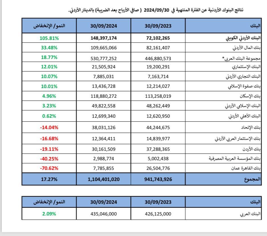 النتائج المالية للبنوك الاردنية و الأرباح عن الفترة الزمنية في 30/9/2024 بالمقارنة مع الفترة ذاتها خلال عام 2023.