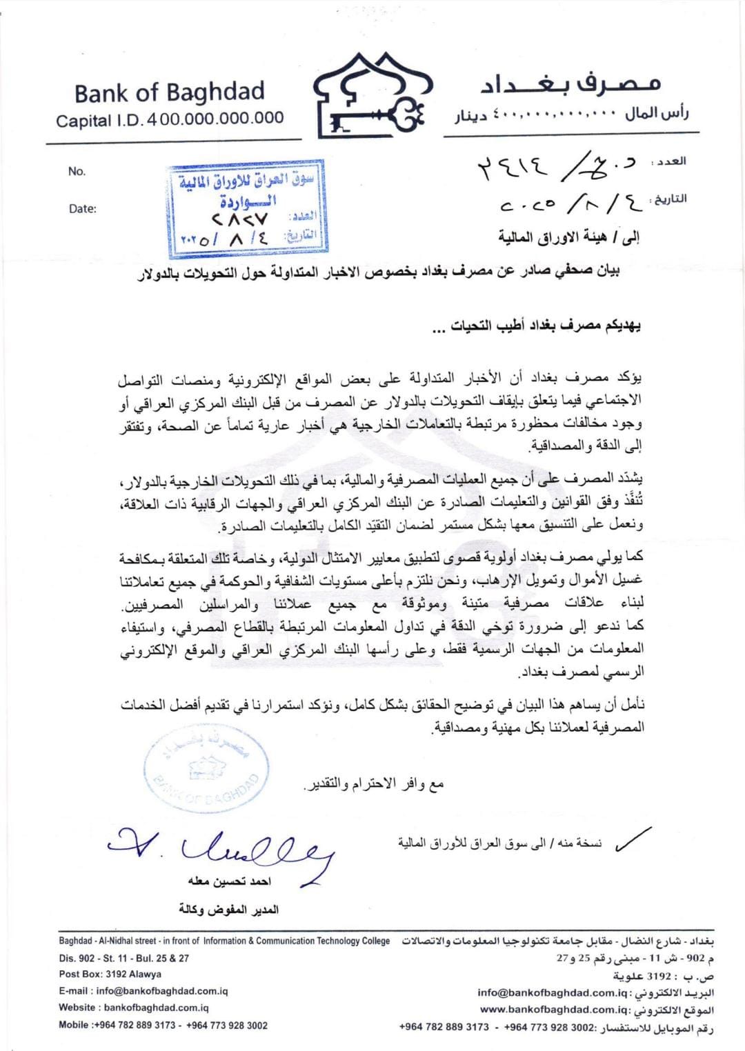 كما شدد مصرف بغداد على التزامه التام بتطبيق إجراءات الامتثال الدولية الخاصة بمكافحة غسل الأموال وتمويل الإرهاب، وعلى سعيه لبناء علاقات مصرفية موثوقة مع جميع عملائه، مؤكداً أن أية أخبار أو معلومات يتم تداولها خارج الإطار الرسمي للمصرف والموقع الرسمي للبنك المركزي العراقي لا يُعتد بها.